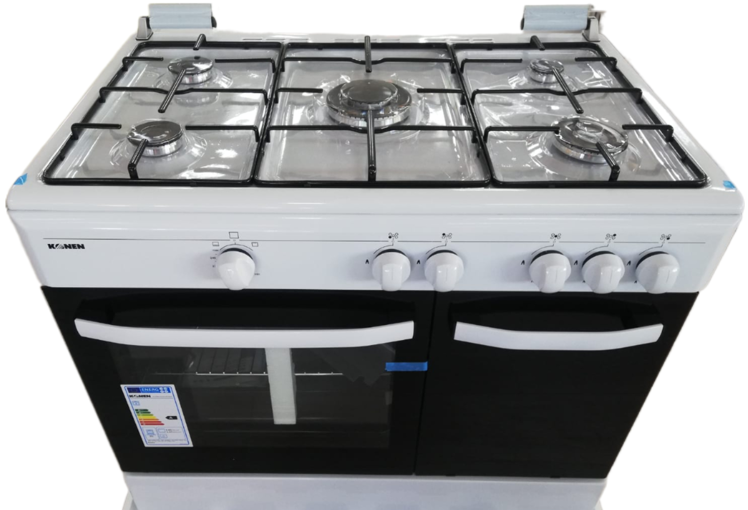 Experimenta la cocción Konen con la cocina de gas de 5 fuegos, horno de 55L a gas, en elegante blanco. Con 90 cm de ancho, esta cocina combina estilo y funcionalidad para tus mejores recetas.