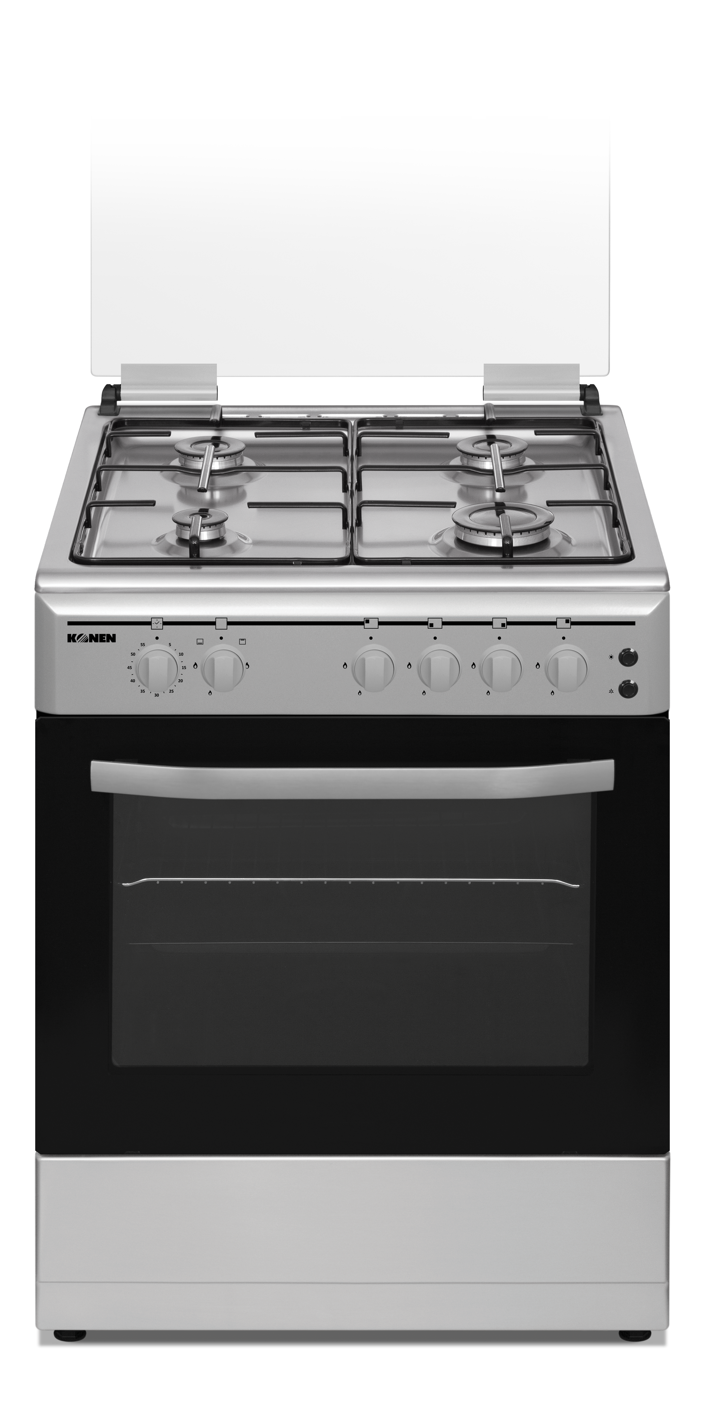 La cocina de gas KONEN KCOGAS60INOXMIS, con 4 fuegos y horno a gas, combina elegancia y funcionalidad. Con 60 cm de ancho y 85 cm de alto, su diseño en negro y acero inoxidable es ideal para cocinas compactas konen. Perfecta para cualquier hogar moderno.