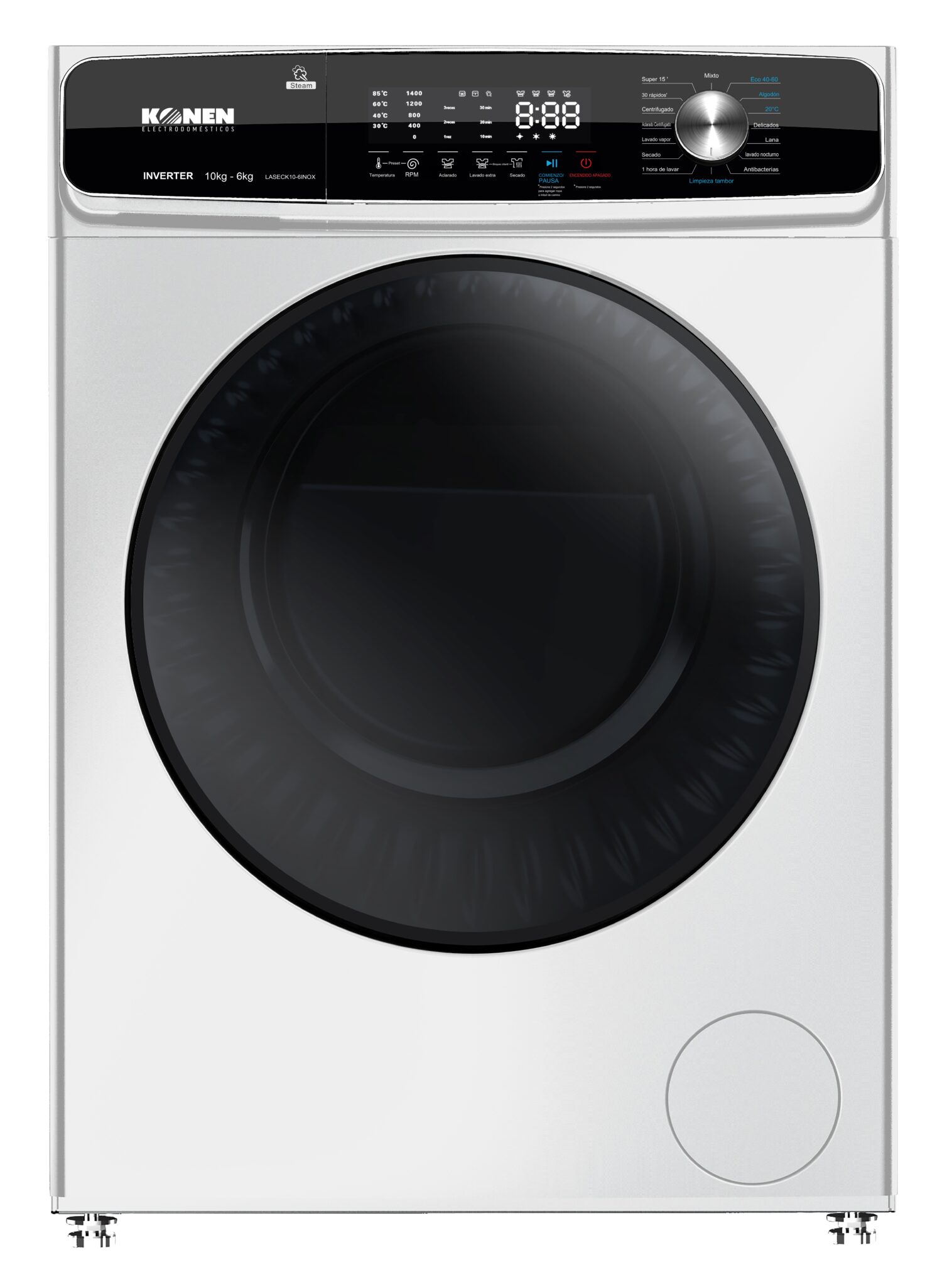 La lavadora-secadora KONEN LASECK106WH combina eficiencia y estilo en un diseño inox. Con 1400 RPM, 10 kg de capacidad de lavado y 6 kg de secado, es ideal para cualquier hogar. Lavadoras Konen ofrecen rendimiento superior y eficiencia energética C en cada ciclo.